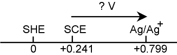 Ag/Ag+ の標準電極電位は +0.799 V vs. SHE である (25℃).この電位を SCE を基準に見れば,0.799 - 0.241 = 0.558 V となる.