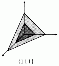 ※とはいっても,ここがある意味一番難しいところでもある.(111) 面の面間隔を求めようとして,どこが面間隔かわからなかった人もいたようだ.たとえば下の図のように捉えると,面間隔は原点と原点に一番近い面 (濃い三角形で示された面) との距離なので,濃い三角形の重心と原点の間の距離を計算すればいいことがわかるのではないだろうか.
